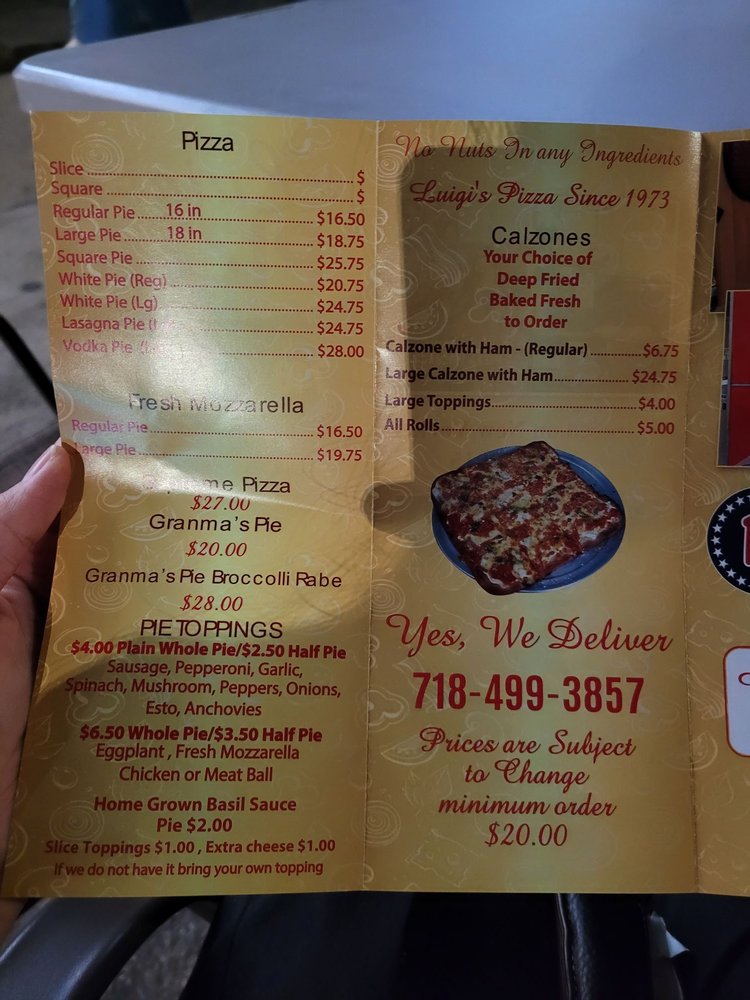 Step into a world of nostalgic pizza perfection at Luigi’s Pizza in Brooklyn, NY. This family-owned pizzeria offers unbeatable prices for delicious pizzas, creating a cozy and welcoming atmosphere for families and friends. The crust is perfectly crispy, the toppings generous, and every bite bursts with flavor. Customers rave about the grandma slice and the classic cheese slice, praising the crispy, thin crust and flavorful sauce. The square slice is a standout, with a firm crust and a symphony of toppings. The friendly staff, old-school vibe, and affordable prices make Luigi’s a must-visit spot for any pizza lover. Whether you're grabbing a slice for lunch or having a pizza night with friends, Luigi's Pizza promises a memorable dining experience.